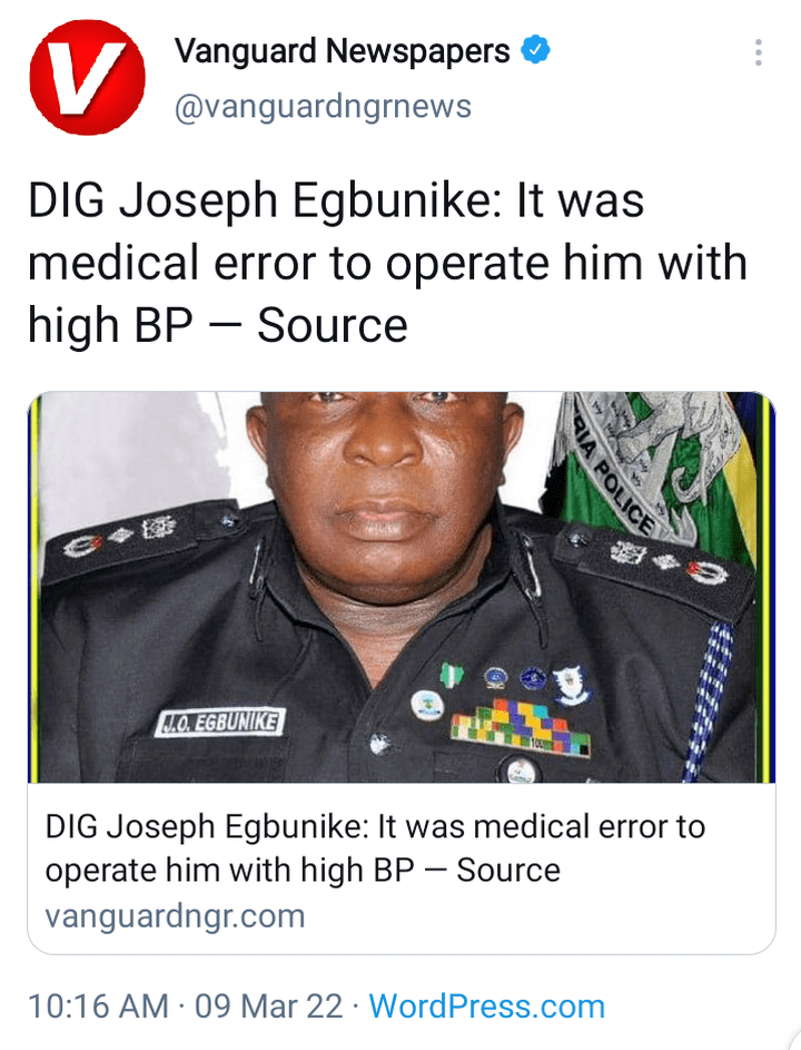 The deputy inspector general of police (dig), joseph egbunike, is dead. Police sources said dig egbunike was driven to national hospital following severe neck pains which troubled him at the weekend for a medical . The deputy inspector general of police in charge force criminal investigations department, dig joseph obiajulu egbunike is dead. A relative of the deceased, who asked not to be named, confirmed his . A deputy inspector general of police in charge of the force criminal investigations department, joseph egbunike, is dead. He was reported to have died 10 . Enlisted in the nigeria police force on march 15, 1988, as a cadet assistant superintendent of police, joseph egbunike rose to the pinnacle . He graduated from the university of nigeria, nsukka, with b.sc (hons) accounting, he holds a bachelor of laws (llb hons.), b.l. The nigeria police force in the early hours of wednesday woke up to the news of dig joseph egbunike's demise.